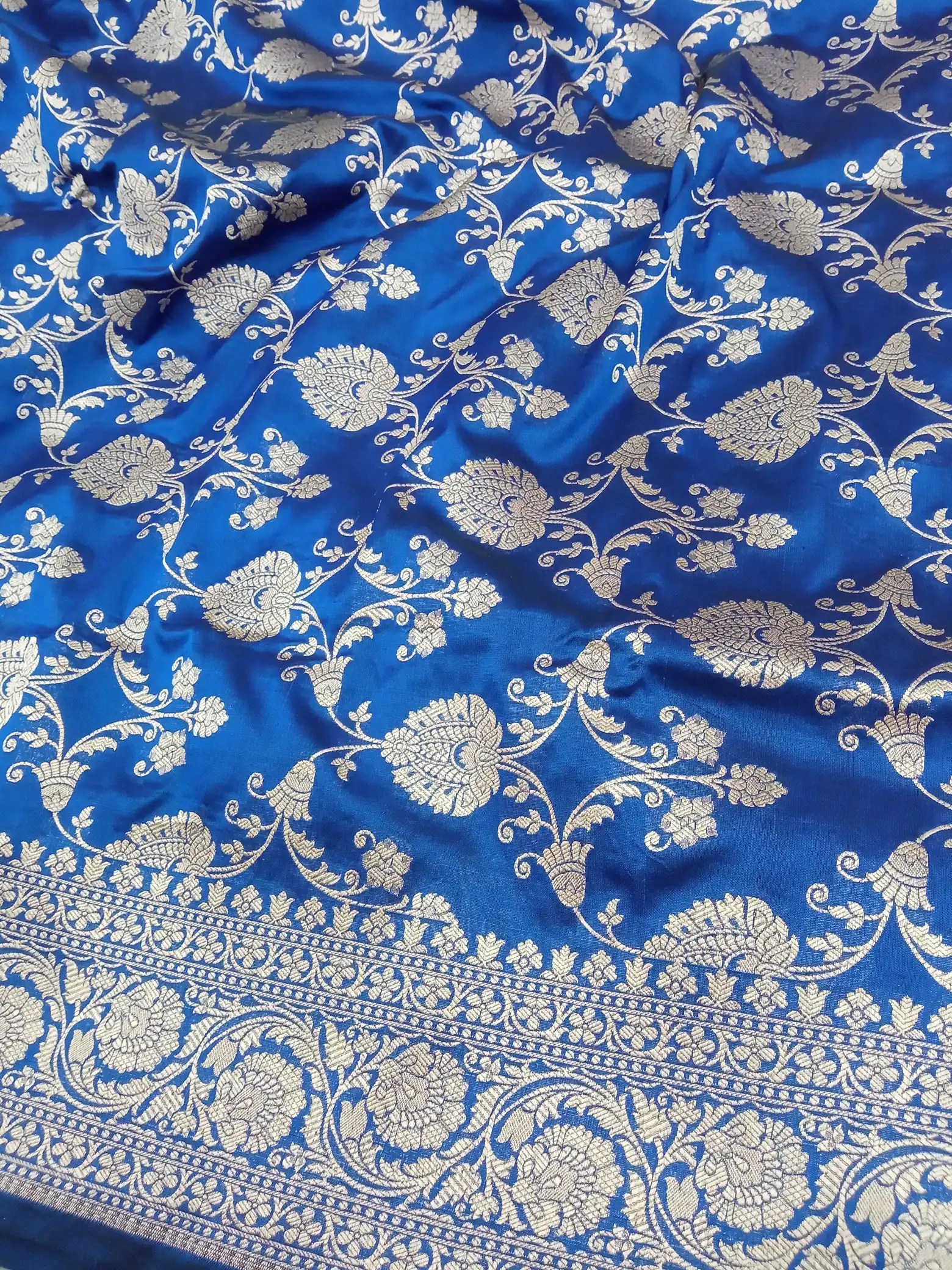 Blue Pure Katan Silk Banarasi Handloom Saree With All Over Jaal Work