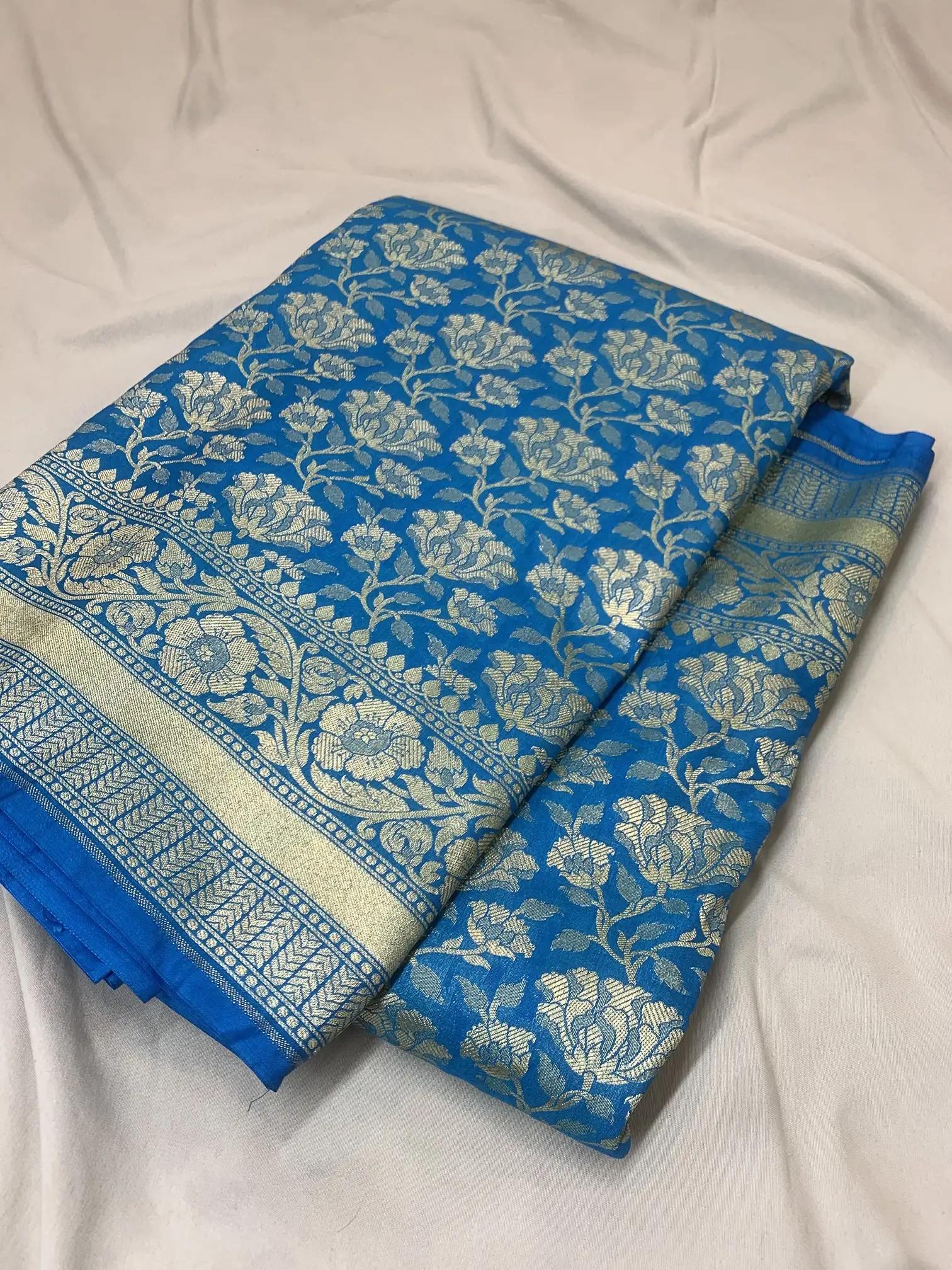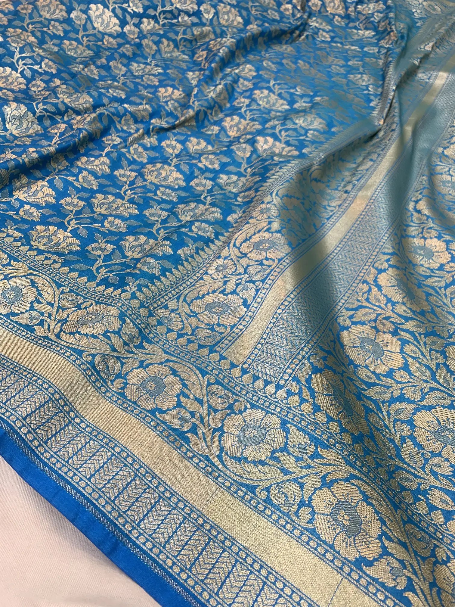 Blue Traditional Pure Katan Silk Banarasi saree With All Over Floral Design