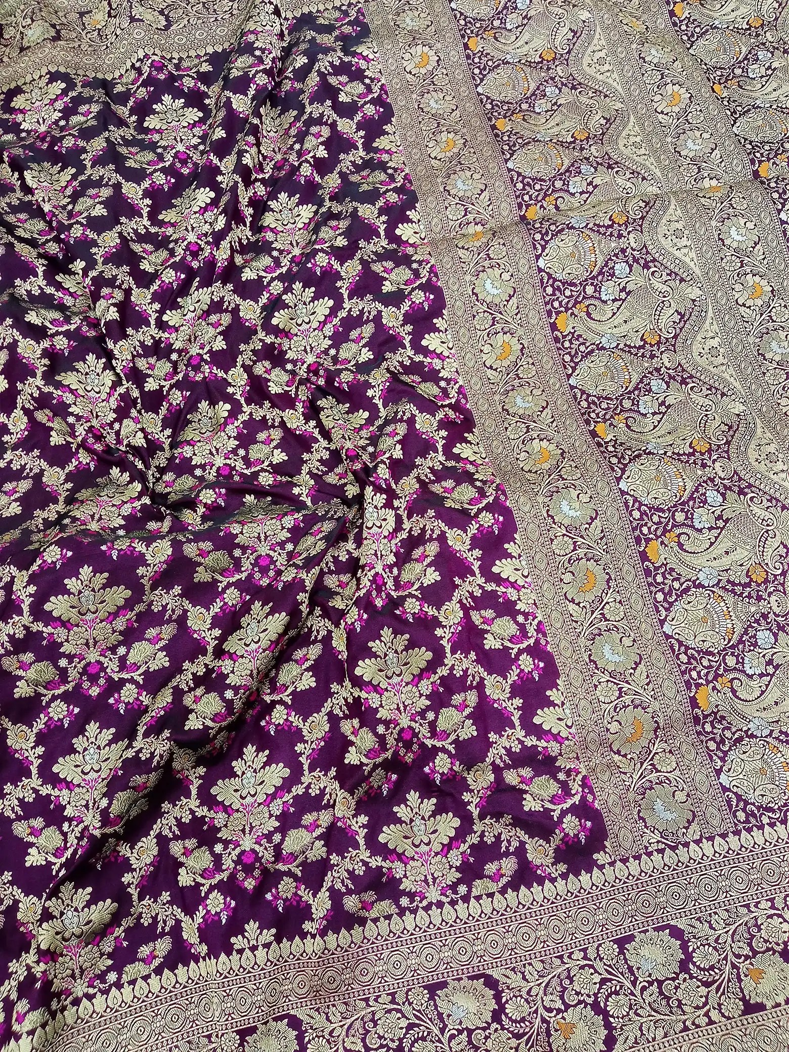 Dark Magenta Satin Silk Banarasi Saree – All Over Jaal Sona-Rupa Meenakari