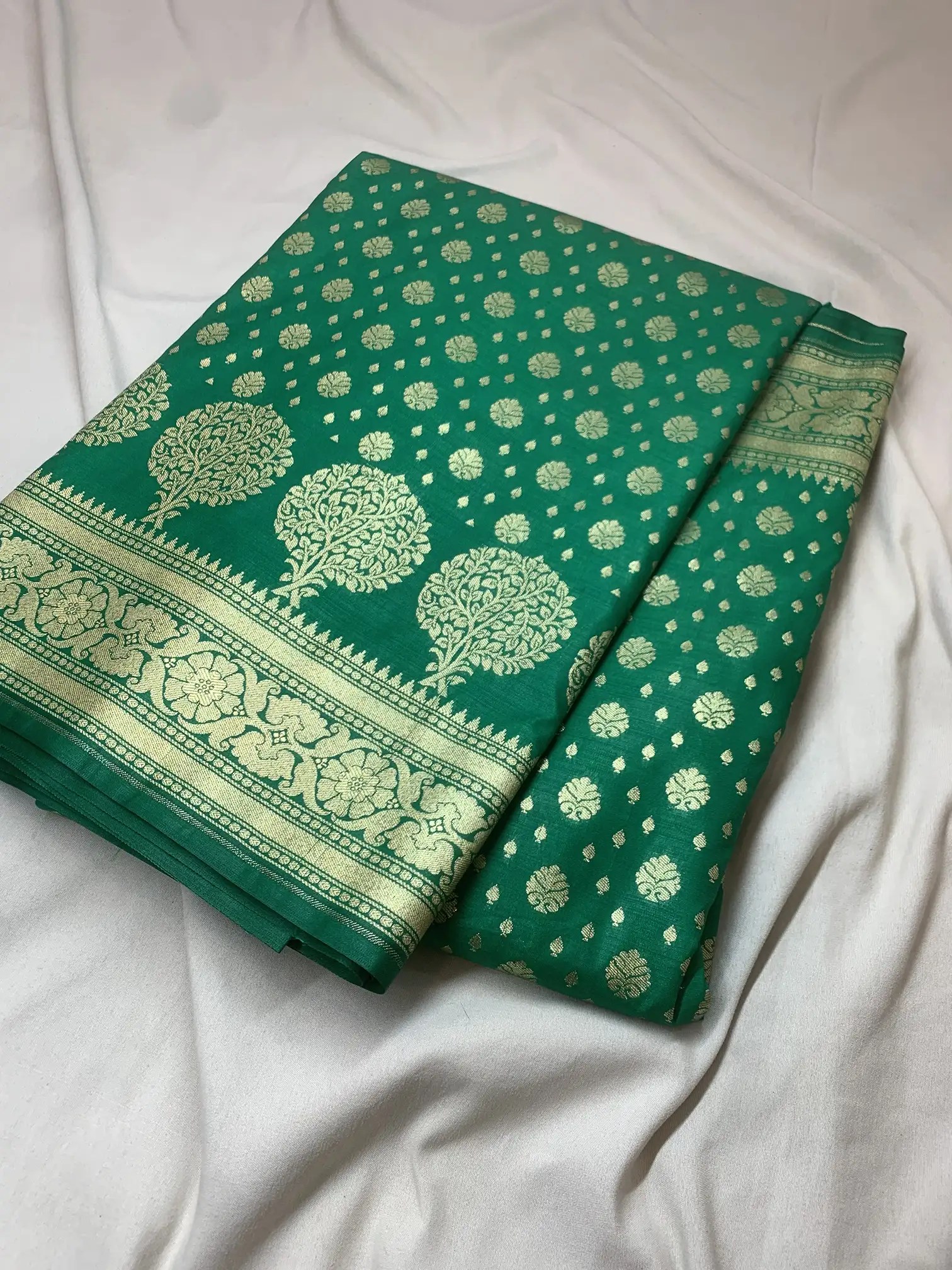 Green Pure Katan Silk Banarasi Saree With All Over Zari Motifs