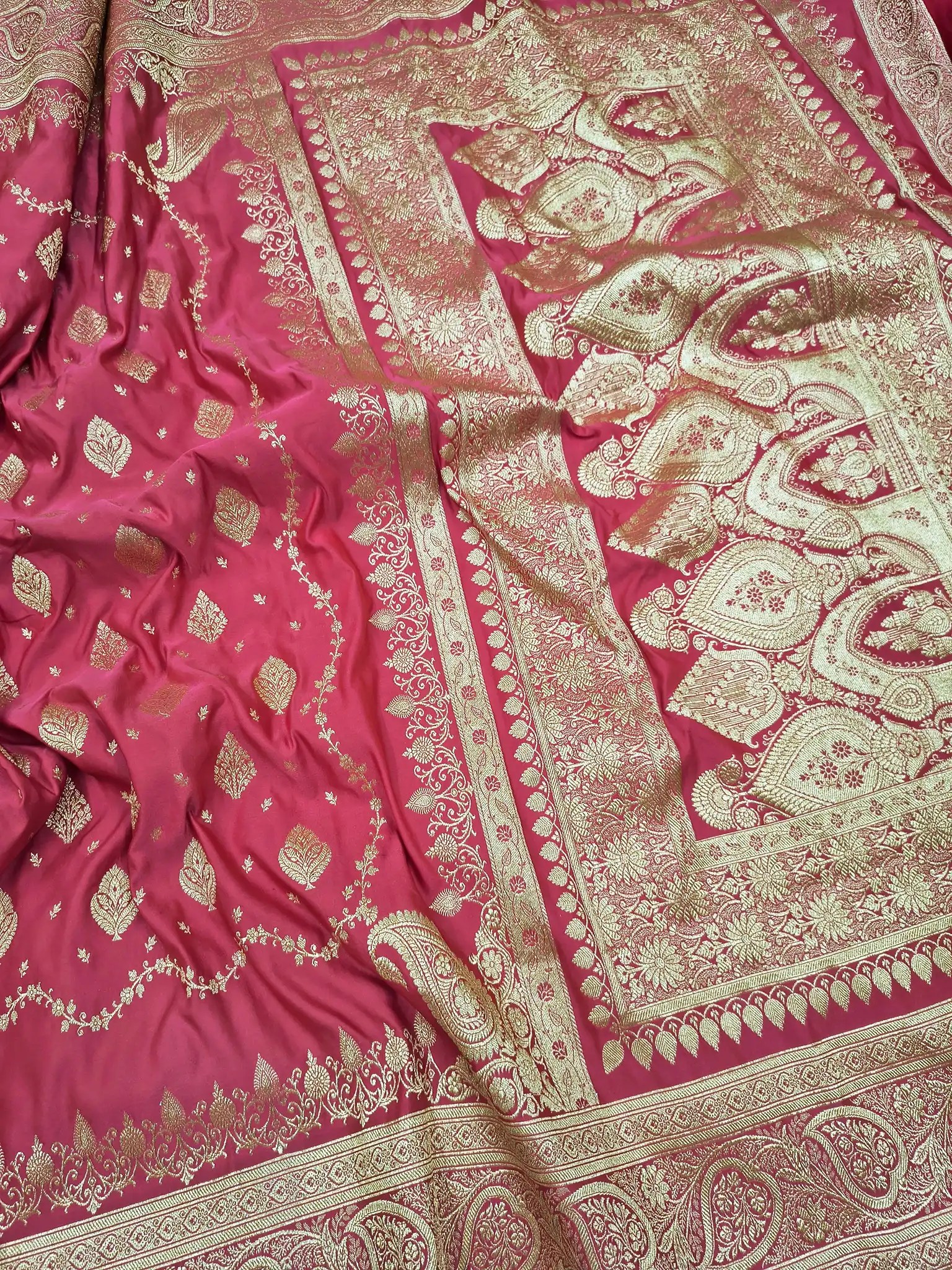 Home Shop Banarasi Sarees Satin Silk Sarees Raani Pink Bridal Banarasi Pure Satin Silk With All Over Golden Zari Motifs